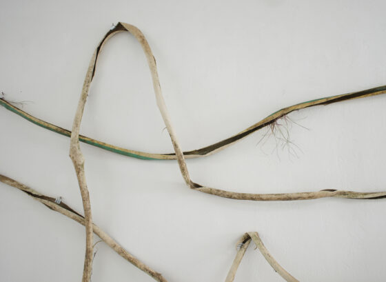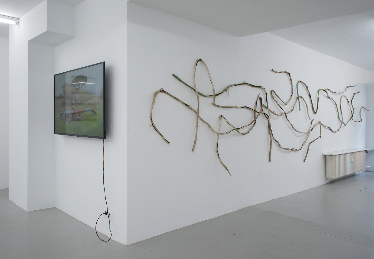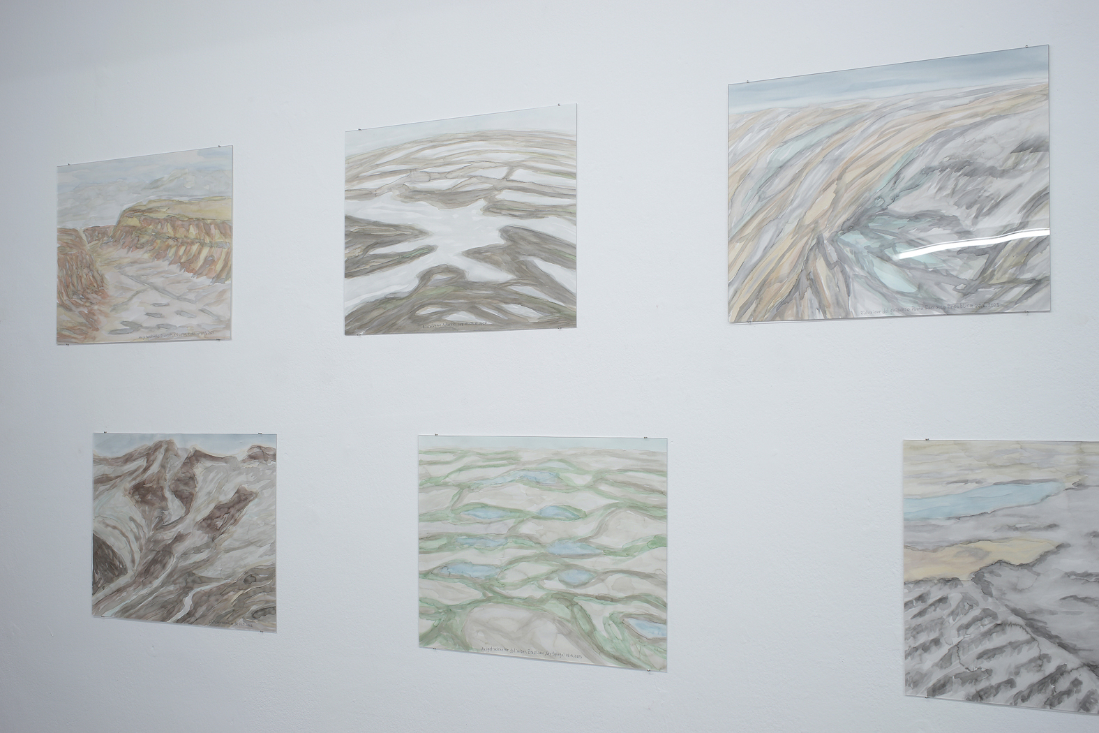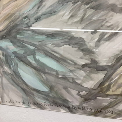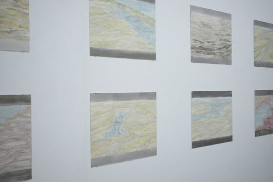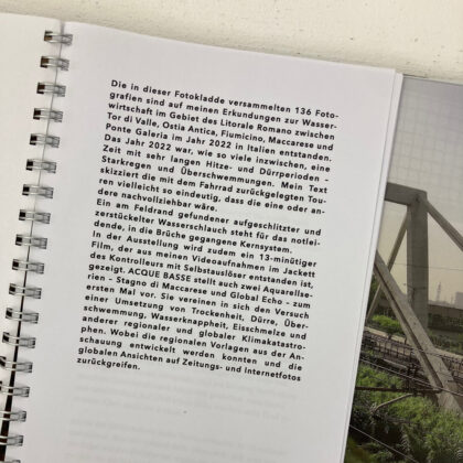 Ideen über Raum sind seit der Antike in Vorstellungen von Natur (Griech. physis) eingelagert. In „Acque basse‘ fühle ich mich mit archaischen und aktuellen Raum- und Naturerfahrungen konfrontiert. Die Aquarelle, Fotos, das Video, Reisebericht und Schlauchstücke konstruieren ein vielschichtiges Portrait einer Gegend im Anthropozän, worin der Mensch mehr denn je auf die ursprüngliche Natur eingewirkt hat. In der Geschichte der Malerei waren es in erster Linie Impressionisten wie Camille Pissarro, die draußen unter freiem Himmel die Auswirkungen des sogenannten technischen Fortschritts am Anfang der 1. industriellen Revolution im 19. Jahrhundert in Bildern festhielten. Die Aquarelle von Doris Frohnapfel sind nachträglich entstanden und basieren auf den Eindrücken der Künstlerin, den Fotos und Vorlagen aus Zeitungen und dem Internet. Sie zeigen wie die bereiste Landschaft auch noch Monate später die Gedanken der Künstlerin beschäftigten und sie zur Recherche und anschließend zur Aquarellmalerei anregte. Hierbei ist es nicht unwichtig zu bedenken, dass gerade diese Maltechnik die schöpferische