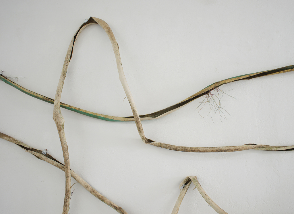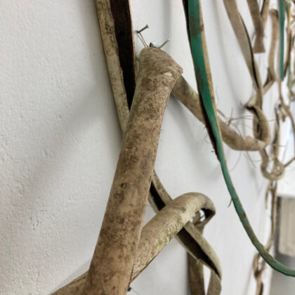 Wahrnehmen, ein gleichermaßen in Raum und Zeit stattfindender sinnlicher Vorgang, ist bekanntermaßen besonders produktiv, wenn er auf eine fremde Umgebung trifft. Ja, „Acque Basse“ reiht sich in den geschichtsreichen Kanon deutscher Künstlerinnen und Künstler ein, die Italien als Gegenstand und Produktionsstätte ihrer Kunst wählten, angefangen von Dürers erstem Venedig-Aufenthalt im Jahr 1494 bis zum Geländeroman „Hain“ von Esther Kinsky von 2008, der hauptsächlich Olevano Romano, eine Gegend nordöstlich von Rom, gewidmet ist. Frohnapfel setzt gezielt unterschiedliche Medien ein um ihre Geschichte einer Landschaft zu erzählen. „Acque basse“, entstanden zwischen 2022 und 2025, besteht neben einem 13-minütigen Video, aus über 100 gebündelten Farbfotografien, circa 20 DIN-A3 großen Aquarellen, einem schriftlichen Reisebericht der Künstlerin, einer singulären Farbfotografie von 90 x 120 cm und schließlich den Stücken eines unbrauchbaren Wasserschlauchs.