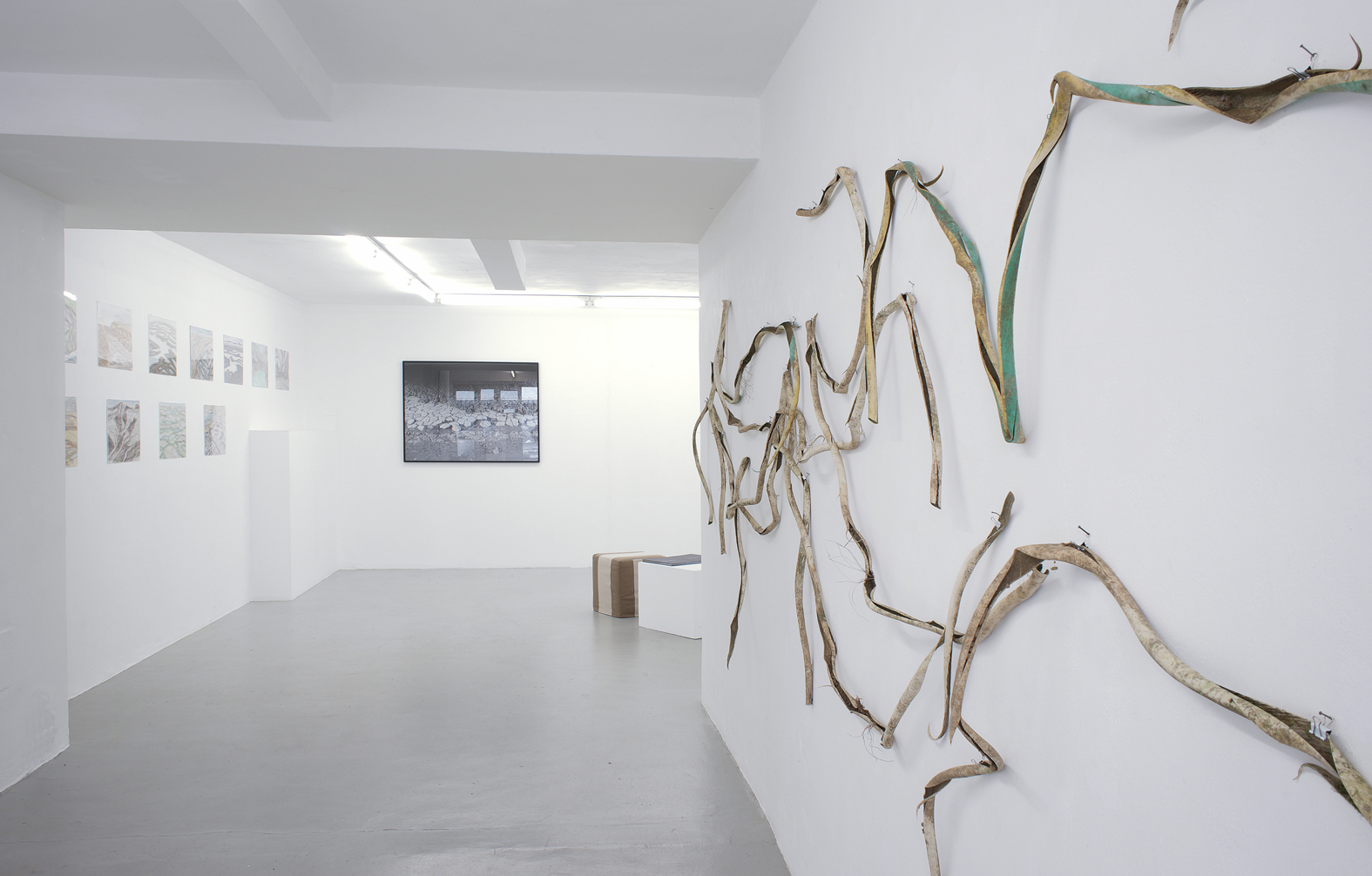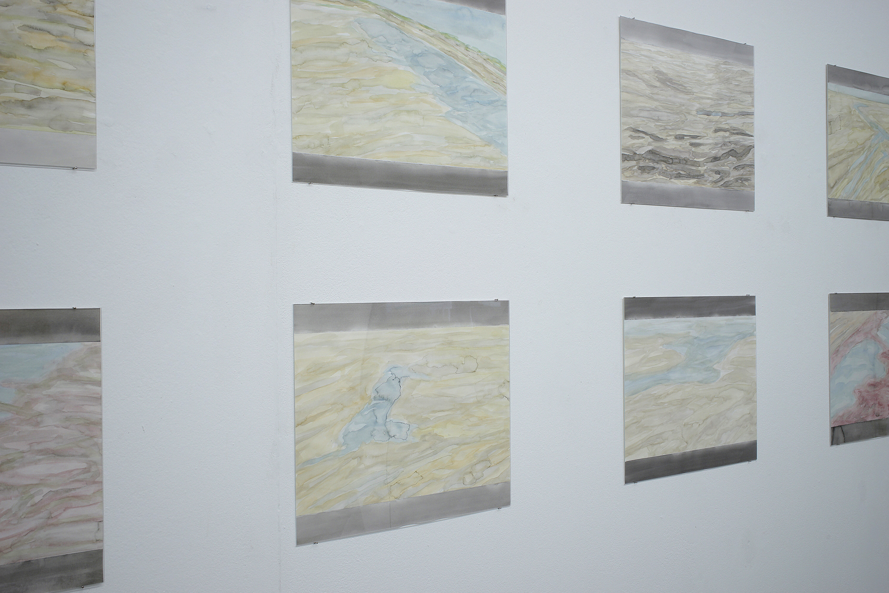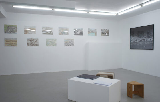 Die Abfolge der Begriffe Raum = Urbild = Schema = Bild findet sich im Zentrum von Immanuel Kants Inauguralschrift von 1770. „Innerhalb gut eines Jahres – dazwischen liegt die wiederholte Lektüre des Briefwechsels zwischen Leibnitz und Clarke – kommt es [bei Kant] zur entscheidenden Umstellung, welche den wohl massivsten Einschnitt in der Begriffsgeschichte des Raums bedeutet: Der Begriff des Raumes ist reine Anschauung und Raum daher »erster formaler Grund der Sinnenwelt«“.1 An die erhellenden Sätze aus Stephan Günzels Vorwort des Bandes „Raumtheorie”, fühlte ich mich erinnert, als Doris Frohnapfel mir das erste Mal von ihrer künstlerischen Auseinandersetzung mit einer mir bis dahin unbekannten Gegend in Italien erzählte. Denn „Acque basse“ ist eine präzise, wohlüberlegte und über Jahre hinweg entstandene Beschreibung von Raum, eine geo graphia, die changiert zwischen Schema (die Karten in der „Fotokladde“), Beschreibung (Frohnapfels Reisebericht), Urbild (die großformatige Fotografie) und Bild (die Aquarelle). Aber nicht nur Kants Raumphilosophie kam in mir hoch als ich von der Installation erfuhr, sondern auch die von mir sehr geschätzten Beschreibungen italienischer Landstriche Esther Kinskys, sowie zum Teil (wieder-)entdeckte Autoren des nature writing (Henry David Thoreau und zum Beispiel die deutschen Autoren Barthold Heinrich Brockes oder Peter Simon Pallas). Allen gemeinsam ist ihre schauende Aufmerksamkeit für die abseitigsten und unscheinbarsten Naturphänomene.