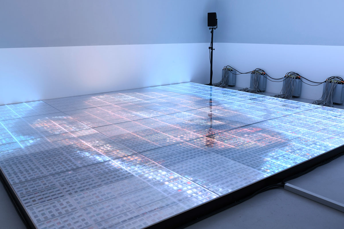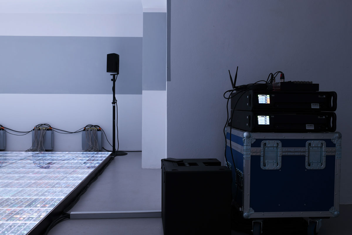 Dem Tanzboden gemäß, werden die Rhythmen der Songs wieder in bewegte Lichtstrukturen übersetzt: Als dritte Ebene von Dance Floor fungiert ein auf die Diodenketten gespieltes Video, das Bild- und Tanzfläche mit Lichteffekten im Rhythmus der Songs meist in schwarzweiß und mitunter in allen RGB-Farben versieht. So steuern Signale mit grafischen abstrakten Patterns, wie Starfield-Bildschirmschonern, Bildstörungen, Perforierungen und Filmversatzstücken aus Andy Warhols epischen 16mm-Filmen oder Duchamps Rotoreliefs die LED-Lichter an. Das Bildkompendium des Bodens wird durch diese visuellen Effekte überflutet und pulsierend in Bewegung versetzt. Dabei sind es die Orte und Erfahrungen dieser Bilder, die Bedingungen ihrer Projektion und Aufführung, im Seminarraum, im Institut, im Archiv und hier im Ausstellungsraum, die als Bildgrund und gemeinschaftsstiftendes Element sichtbar werden. Dance Floor gibt die Bühne frei, lässt Bilder, Moves, Songtexte in uns und auf die sich bewegenden Körper im Raum einwirken und hinterfragt damit Bild- und Körperpraktiken im Moment einer Krise der sozialen Interaktion.